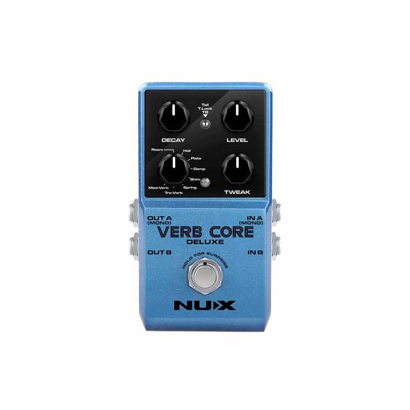 La NUX VERB CORE DELUXE est une pédale de réverbération (« reverb ») avec 8 types de réverbération différents : Room, Hall, Plate, Damp, Shim, Spring, Tre-Verb et Mod Verb.