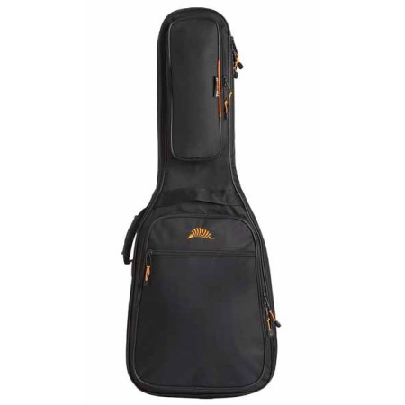 Housse entièrement rembourrée de 8 mm de GFlex. Renforts au niveau des mécaniques et chevalets pour prévenir d’une usure prématurée. Grande poche extérieure. 2 sangles molletonnées style sac à dos. Pince pour médiators.